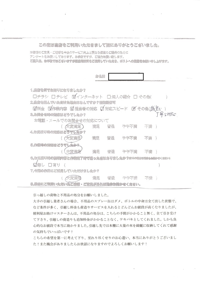 50代女性:不用品回収マンションに引っ越すためにベッド、衣装ケース、ソファなどの回収をしていただきました。問合せから作業までとてもスムーズで、問題なく作業終了していただけました。30分も経たないうちにキレイに回収してくれて依頼して本当に良かったです。