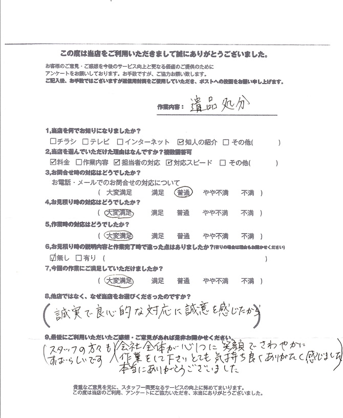 60代女性:遺品整理2階建ての一軒家の遺品整理をお願いしました。切手や現金、写真など、かなりの量の貴重品を探し出してくださり、必要だった土地の権利書まで見つけてくださいました。お見積の方が作業に来ていただけたのも嬉しかったです。