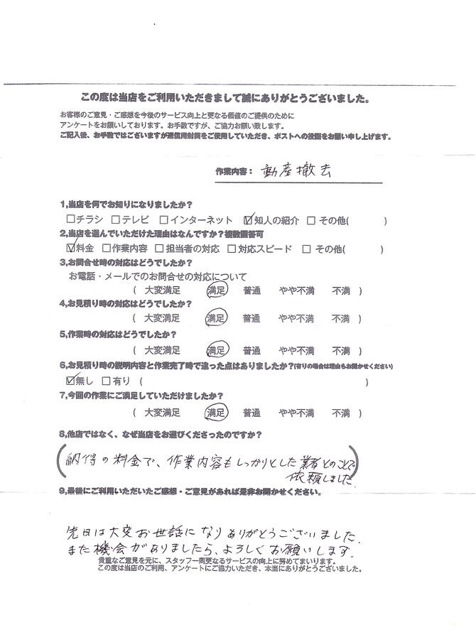 マンションに引っ越すためにベッド、衣装ケース、ソファなどの回収をしていただきました。問合せから作業までとてもスムーズで、問題なく作業終了していただけました。30分も経たないうちにキレイに回収してくれて依頼して本当に良かったです。